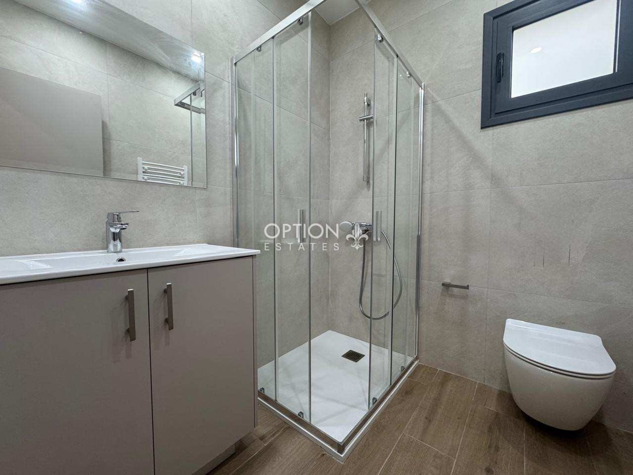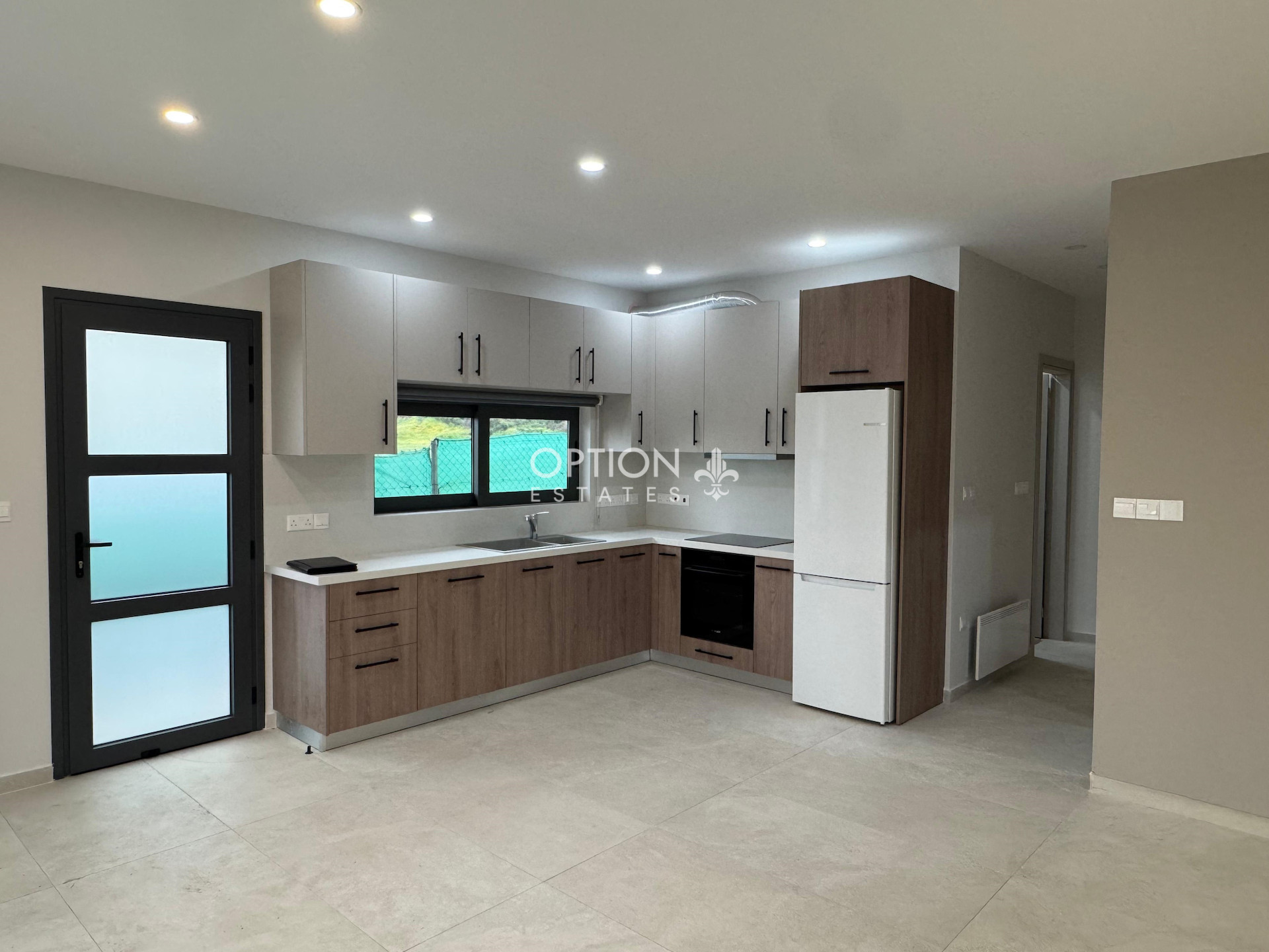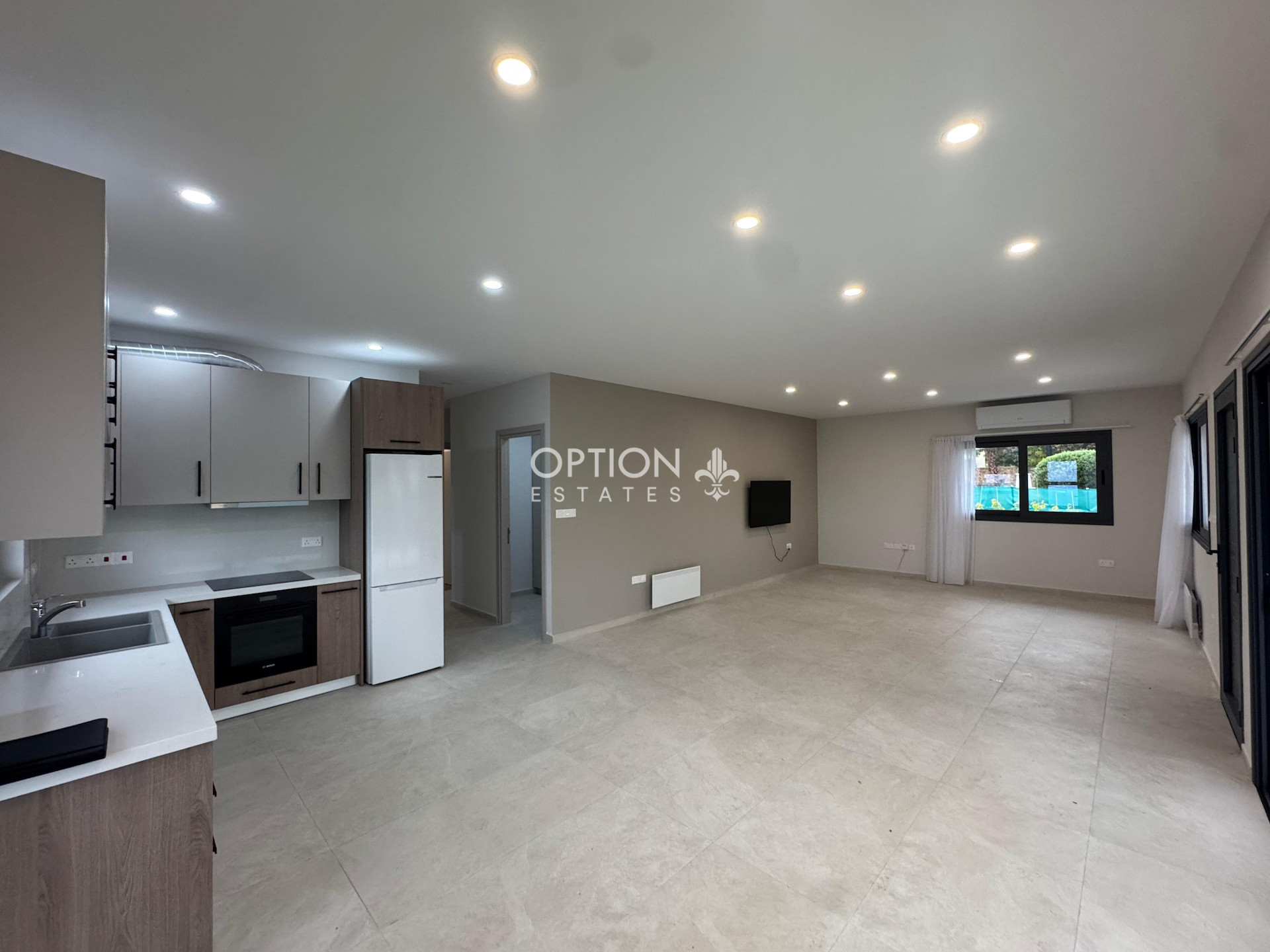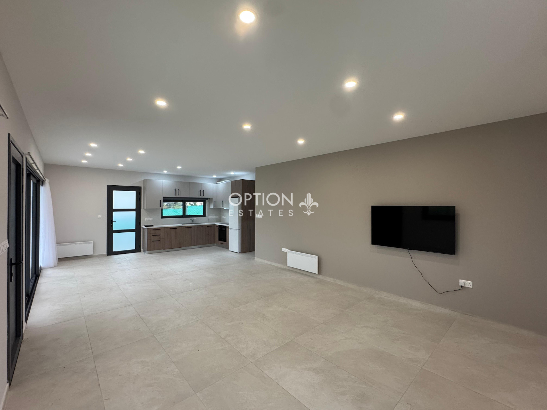 Entering the house you find an open plan living room, combined with the dining area and the kitchen. A corridor leads to the master bedroom featuring en-suite shower and to the two spacious bedrooms with fitted wardrobes, which share the main bathroom. There is also a laundry area.